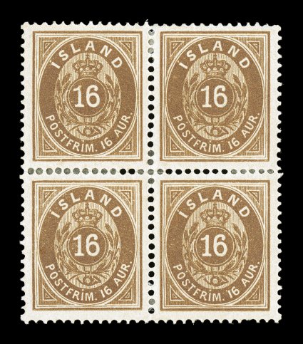 choice multiples of this issue are quite elusive and the Facit catalo#12, 1876 16a Brown, perforated 14 x 13 1/2, very scarce mint block of four, extraordinarily well centered, deep luxuriant color, o.g., couple of trivial h.r.'s, very fine and choice; multiples of this issue are quite elusive and the Facit catalog gives a 12x the normal price of a single for a block of four (Facit #13; 12,000SEK). (Image) Facit 12,000SEK