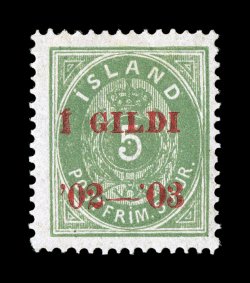 1078 og 64 64, 1902-03 10a Carmine, black overprint, perforated 14 x 13 12, wonderfully well margined mint example of this rarity from the Í GILDI series, rich color, o.g., lightly