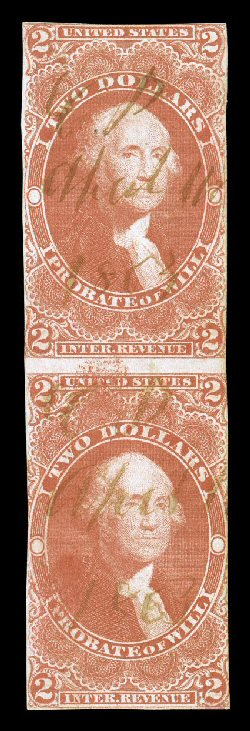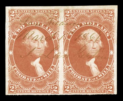 faint crease and a tiny sealed tear at bottom, fine appearance one#R83a, $2.00 Probate of Will, imperforate, an exceedingly rare vertical pair, bright color, margins range from clear to slightly into the design at the sides, bottom stamp with faint crease and a tiny sealed tear at bottom, fine appearance; one of only two vertical pair recorded in the Curtis census. (Image) $11,500.00