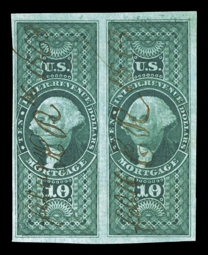 bottom of the right margin, otherwise very fine-extremely fine a ve#R95a, $10.00 Mortgage, imperforate, horizontal pair, deep intense color and impression, full to mostly large margins all around, 1863 ms. cancel, small horizontal crease in the bottom of the right margin, otherwise very fine-extremely fine; a very scarce pair. (Image) $1,600.00