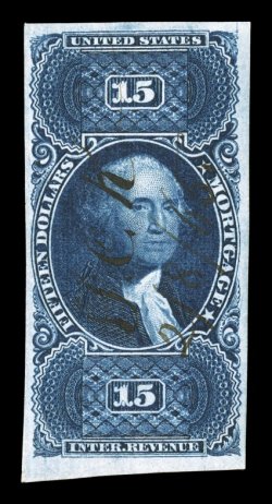 appearance.#R97a, $15.00 Mortgage, imperforate, four large margins, excellent color in an especially dark shade, 1865 ms. cancel, couple light creases, very fine appearance. (Image) $2,700.00