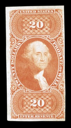 stamp.#R99a, $20.00 Probate of Will, imperforate, clear to mostly large margins, lovely bright color, small 1864 ms. cancel, a very fine example of this scarce imperforate revenue stamp. (Image) $2,000.00