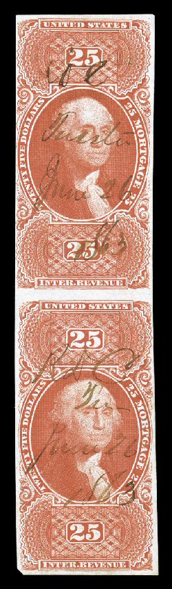 cancel, otherwise very fine a rarely offered pair.#R100a, $25.00 Mortgage, imperforate, horizontal pair, full to mostly large margins around, rich color, 1865 ms. cancels, slight break in the paper on the right stamp from the cancel, otherwise very fine; a rarely offered pair. (Image) $3,000.00