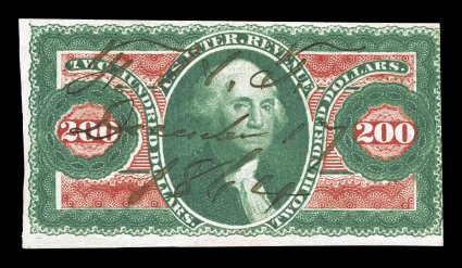 value.#R102a, $200.00 U.S.I.R., imperforate, three large margins, just into the design at right, bright rich colors, 1864 ms. cancel, a fine example of this scarce high value. (Image) $2,500.00