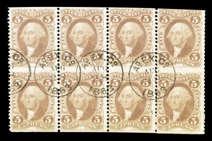 fine.#R25b, 5c Express, part perforate, block of eight (4x2), fresh, cancelled by Adams Express Company 1863 c.d.s. handstamps, trivial crease at bottom right, fine. (Image) $600.00+