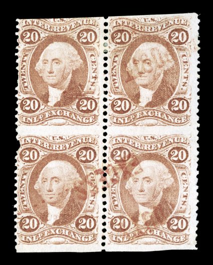 left stamp with pulled perf., fine the Curtis census records on#R42b, 20c Inland Exchange, part perforate, block of four, cancelled by a scarce red "Duty/ Express.../Deposit" straight line handstamp, bottom stamps with light wrinkle, bottom left stamp with pulled perf., fine; the Curtis census records only eight blocks of any size. (Image) $300.00