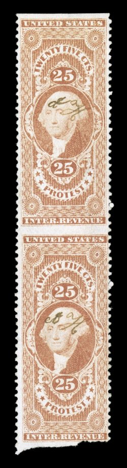 which is the largest multiple of this part perforate revenue.#R49b, 25c Protest, part perforated, vertical pair, bright color, petite ms. cancel, irregularly cut at bottom, top stamp with trivial crease, fine appearance; a very scarce pair which is the largest multiple of this part perforate revenue. (Image) $1,400.00