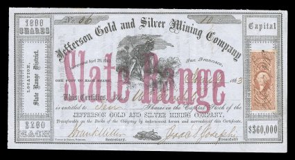 centering, overall a very fine document any example of R50b on docum#R50b, 25c Warehouse Receipt, part perforate, single used on attractive 1863 Jefferson Gold and Silver Mining Company certificate, unusually fresh, stamp with typical fine centering, overall a very fine document; any example of #R50b on document is scarce, but it is especially desirable on this beautiful mining certificate; cataloged simply as a used stamp. (Image) $550.00+