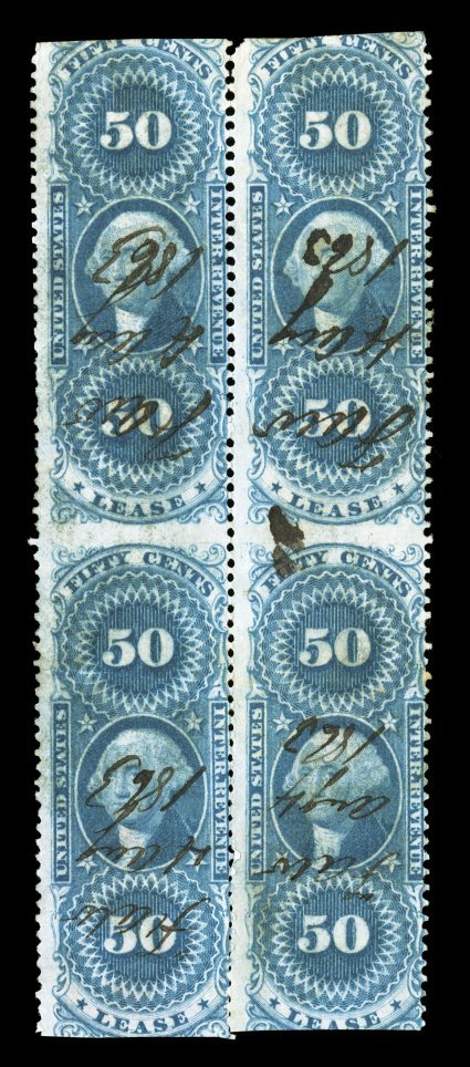 any size have been recorded.#R57b, 50c Lease, part perforated, block of four, deep rich color, 1863 ms. cancels, light crease in bottom pair, perf. separation at bottom, fine appearance; only six blocks of any size have been recorded. (Image) $1,250.00