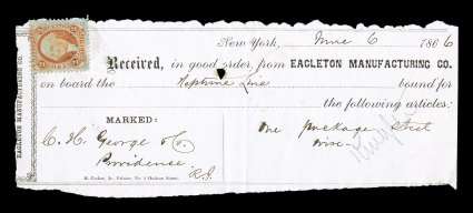 adhesive, fine cataloged as a used stamp.#R6e, 2c Bank Check, orange on green paper, uncancelled single on Stonington Line railroad freight document dated June 5, 1866, document with small cut cancel well away from adhesive, fine; cataloged as a used stamp. (Image) $700.00+