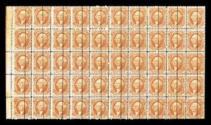 the outer edges, small thin affects two stamps, fine this is the#R10c, 2c Express, orange, remarkable left sheet-margin block of 50 (10x5), deep vibrant color, light handstamped and ink line cancels, some reinforced or separated perfs. along the outer edges, small thin affects two stamps, fine; this is the largest recorded multiple, being one of two known blocks of 50 (the other is the ex-Joyce block that has an identical cancel). (Image) $745.00+