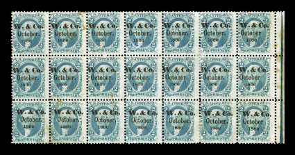otherwise fine.#R13c, 2c Proprietary, blue, right sheet-margin block of 21 (7x3), bright color, each with "W.& Co., October, 1866" printed cancel, a few light stains and minor perf. reinforcing, otherwise fine. (Image) Est. $200-300