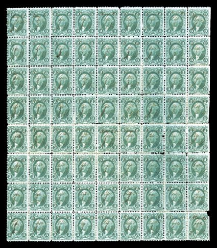 such a large sized multiple (the middle horizontal row of perforation#R16c, 3c Foreign Exchange, a remarkable block of 72 (9x8), strong rich color, 1865 ms. cancels, small faults and some reinforcement of separated perfs. as would be expected on such a large sized multiple (the middle horizontal row of perforations may have been completely separated), fine appearance; this is one of the largest known multiples of any First Issue revenue stamp outside the common 2c values, it is far and away the largest multiple of #R16c, as well as being the largest multiple of any Three Cent First Issue revenue stamp. (Image) $1,242.00+
