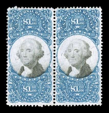 of this stamp, two pairs (including this example) and a strip of thr#R121, $1.60 Blue and black, mint horizontal pair, rich colors, large part original gum, trivial minute hinge thins, fine-very fine; the Curtis census lists only three multiples of this stamp, two pairs (including this example) and a strip of three. (Image) for used $1,200.00