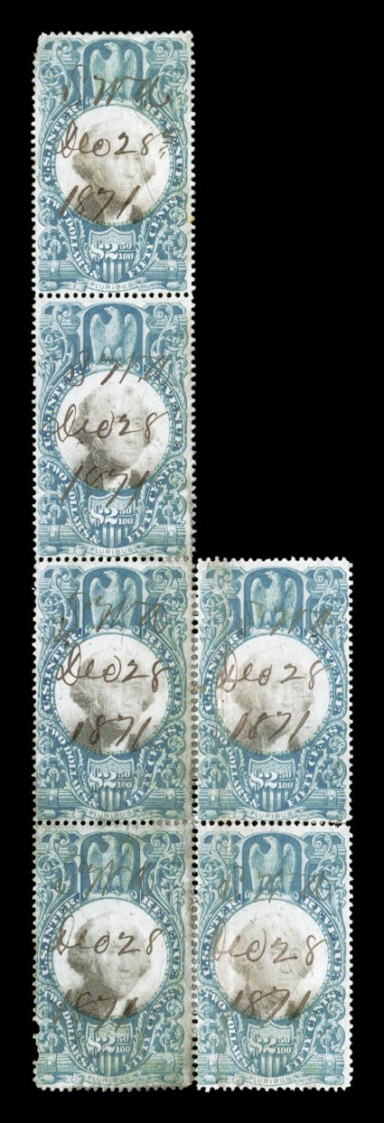 mostly on bottom stamps, fine appearance the largest recorded multipl#R124, $2.50 Blue and black, irregular reconstructed block of six, comprised of a vertical strip of four and vertical pair, 1871 ms. cancels, small faults including staining mostly on bottom stamps, fine appearance; the largest recorded multiple, being one of only two blocks of six recorded. ex-Turner. (Image) $645.00+