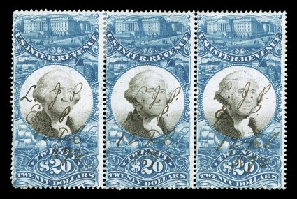 multiples exist (a block and strip of four).#R129, $20.00 Blue and black, horizontal strip of three, brilliantly rich colors, 1872 ms. cancels, end stamps each with a shallow thin spot, otherwise fine; only two larger multiples exist (a block and strip of four). (Image) $2,050.00+
