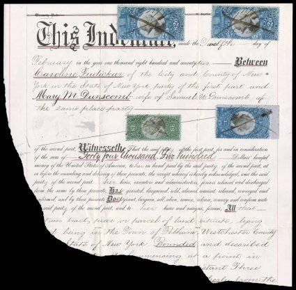 horizontal file fold through the stamps, very fine appearance catalog#R116, 60c Blue and black, horizontal strip of three and two singles on back of 1872 mortgage document, cancelled by light red ms., stamps nicely centered and fresh, light horizontal file fold through the stamps, very fine appearance; cataloged as used stamps. (Image) $775.00+