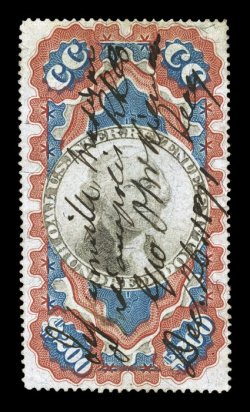 Office, New York, and not the typical cut or heavy ms. cancel found#R132, $200.00 Red, blue and black, "Small Persian Rug", an outstanding used example of this popular stamp, being cancelled solely by fancy oval handstamps of the Surrogates Office, New York, and not the typical cut or heavy ms. cancel found on this stamp, rich luxuriant colors and well incised impressions, attractively centered, very fine; almost never encountered both sound and with a handstamped cancel. (Image) $6,500.00