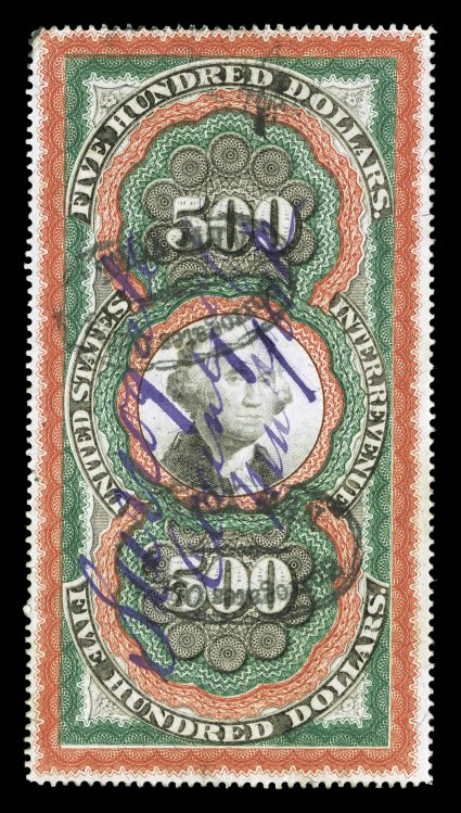 fine appearance this was originally on a mortgage document with#R133, $500.00 Red orange, green and black, "Large Persian Rug", rich vibrant colors on fresh white paper, ms. Morris and Essex Railroad Co. 1871 cancel, horizontal crease, very fine appearance; this was originally on a mortgage document with nine other $500.00 Persian Rugs, when no buyer could be found at a 1949 auction, the ten stamps were sold individually; ex-Shellabear. (Image) $13,500.00