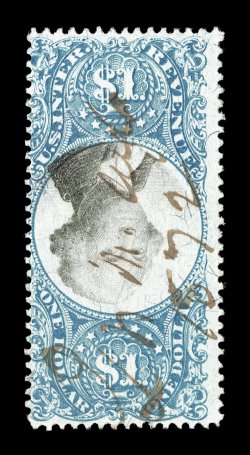rather than the more commonly seen punch cancel, but also because it l#R118a, $1.00 Blue and black, Center Inverted, rich colors, 1872 ms. cancel, fine; a highly desirable example of this rarity, not only because it possesses a manuscript cancel rather than the more commonly seen punch cancel, but also because it lacks the faults and/or repairs that plague this value. (Image) $5,000.00