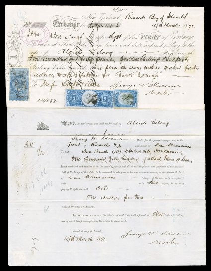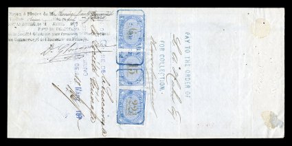 four have embossed revenue stamps of New Zealand ranging from 8p to 18,New Zealand foreign exchange checks with U.S. revenues, four checks originating in New Zealand, one with 8p Blue revenue tied, two with Great Britain revenue stamps, and all four have embossed revenue stamps of New Zealand ranging from 8p to 1/8, U.S revenues include one with 20c Inland Exchange, one with 10c and 50c Second Issue, one with 5c and 60c Second Issue, and one three issue franking of 25c Certificate, 25c Second Issue and 15c Third Issue, documents in typical mixed condition; a rare group of mixed country revenue usages. (Image) Est. $400-500