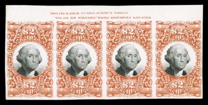 and Black Imperforate known, that being a horizontal pair listed#R135c, 2c Orange and black, imperforate, block of sixteen (4x4), lightly cancelled, faults, nonetheless a highly collectable items, as there is only one other Two Cent Orange and Black Imperforate known, that being a horizontal pair; listed but not priced in Scott. (Image) Est. $2,000-3,000