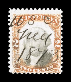 a canceling device), otherwise very fine an exceedingly rare error.#R135 var., 2c Orange and black, double impression of the frame, with two distinct impressions of the orange frame, strong colors, appears unused, two tiny pinholes (may be from a canceling device), otherwise very fine; an exceedingly rare error. (Image) $1,500.00
