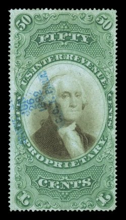solely by a c.d.s. handstamp.#RB8a, 50c Green and black on violet paper, strong colors, centrally struck blue handstamped c.d.s., small thin spot, fine appearance; this value is seldom encountered cancelled solely by a c.d.s. handstamp. (Image) $725.00