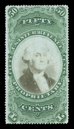 appearance.#RB8a, 50c Green and black on violet paper, seldom seen mint example, remarkably well centered, rich colors, full original gum, a few tiny thin specks, extremely fine appearance. (Image) for used $725.00