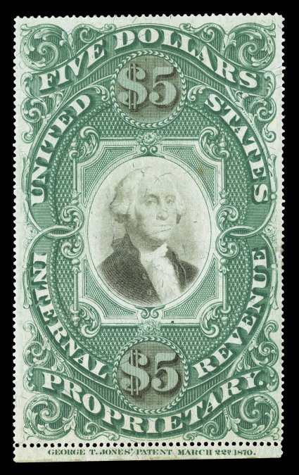 clarity of impression, full original gum, a few h.r.s, tiny thin#RB10a, $5.00 Green and black on violet paper, a remarkable bottom margin example with full imprint of George T. Jones, excellent centering, rich bright color and an excellent clarity of impression, full original gum, a few h.r.'s, tiny thin speck, a small edge repair at right and a single light toned spot, extremely fine appearance; an extraordinarily rare combination of physical characteristics: original gum, choice centering and a full imprint in the margin; because the Cunliffe collection contains three examples of the Five Dollar Proprietary stamp with an imprint (this mint single, a rejoined pair, and the fabulous strip of three), one might get the impression that they are somewhat available, however, in our exhaustive search of past revenue catalogs, we were unable to locate any other examples. (Image) for used $10,000.00