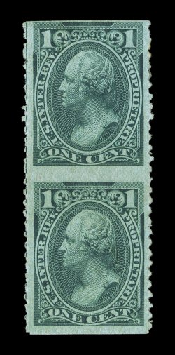 rarity of the 1875 Proprietary Issue, being the only example we ha#RB13c var., 3c Orange, roulette 6, vertical pair, imperforate between, nicely centered, bright color, light 1880 blue handstamp of Jas. F. Lobden, very fine; an important error rarity of the 1875 Proprietary Issue, being the only example we have ever seen; not listed in Scott. (Image) Est. $1,000-1,500