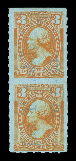 756 O RB13c var. RB13c var., 3c Orange, roulette 6, vertical pair, imperforate between, nicely centered, bright color, light 1880 blue handstamp of Jas. F. Lobden, very fine an important error