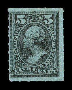 creases and a faint hinge thin, neither of which distract from the very fineTurner Essay 180, Battleship Proprietary, incomplete die essay in green on India, 70x67mm, deep color and impression showing the detailing quite well, two light vertical creases and a faint hinge thin, neither of which distract from the very fine appearance; an enormously rare (if not unique) essay, being the first example we have ever seen, an essential item for the advanced specialist of the popular Battleship issues. (Image) Est. $1,500-2,000