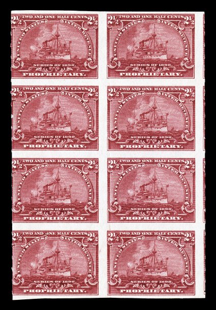 the largest known multiple of this error, as even the normal stamp#RB28a, 2 1/2c Lake, rouletted, vertical pair, imperforate horizontally, block of eight (2x4) containing four error pairs, deep luxuriant color, o.g., never hinged, fine; probably the largest known multiple of this error, as even the normal stamp is not recorded in a larger multiple. (Image) $760.00+