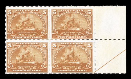 well centered, fresh o.g., three stamps never hinged, very fine a par#RB28a, 2 1/2c Lake, roulette 5 1/2, imperforate horizontally, top margin imprint block of four containing two error pairs, gorgeous color that is especially deep and intense, well centered, fresh o.g., three stamps never hinged, very fine; a particularly handsome block. (Image) $380.00+