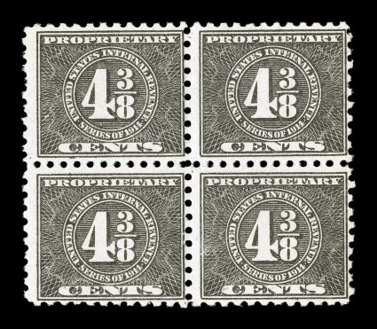block, being one of only three blocks known and the only never hinged#RB42, 4 3/8c Black, mint block of four, fresh color, o.g., never hinged, tiny gum skip on bottom left stamp, single short perf. at left of top left stamp, fine; a very rare block, being one of only three blocks known and the only never hinged block. (Image) for hinged $13,000.00