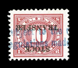 cataloged as mint.#RD34b, 10c Carmine rose, inverted overprint, bright and fresh, blue handstamped cancel, very fine; an exceedingly scarce error; 1990 PSE certificate; unpriced in used condition, cataloged as mint. (Image) for mint $1,550.00