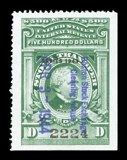 a tiny cut cancel, extremely fine and choice.#RD161, $500.00 Bright green, Series 1943, exceptionally well centered and margined, marvelously bright and fresh, 1944 purple handstamp of the Boston Stock Exchange as well as a tiny cut cancel, extremely fine and choice. (Image) $500.00
