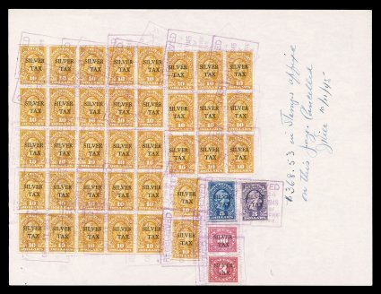 document is Treasury Dept. form 2, transferring 453,137.38 ounces of silver,#RG132, $1,000.00 Gray Silver Tax, seven complete strips of four, tied to the back of a 1945 document by purple boxed handstamps, two stamps also with embossed seal, the document is Treasury Dept. form 2, transferring 453,137.38 ounces of silver, fine-very fine; most impressive; Scott lists but does not price strips of four, therefore cataloged simply as 28 used singles. (Image) $4,480.00+