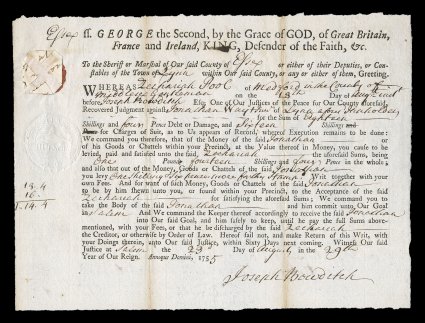 818 c RM2 RM2, 2p Massachusetts embossed, well struck on 1755 Writ of Execution from Middlesex, very fine strike.#RM2, 2p Massachusetts embossed, well struck on 1755 Writ of Execution from Middlesex, very fine strike. (Image) $400.00