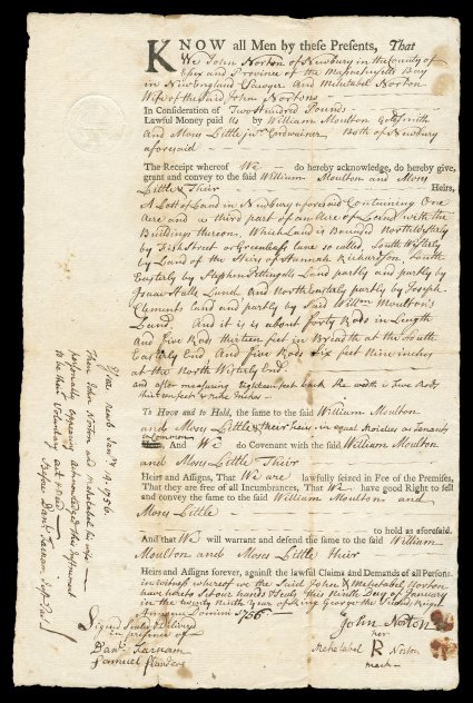 819 c RM4 RM4, 4p Massachusetts embossed, crisp strike at top left of 1756 Conveyance of Land from Newbury, Mass., fine.#RM4, 4p Massachusetts embossed, crisp strike at top left of 1756 Conveyance of Land from Newbury, Mass., fine. (Image) $600.00