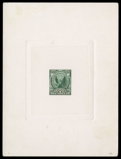 no. 14423 signed L. Lowe, wonderfully bright and fresh, trivial corner#RY3P1, $1.00 Green Firearms, large die proof on India, 75x89mm die sunk on full size 152x203mm card, with serial number 576783 and Nov 7, 1938 handstamps on back, also pencil no. 14423 signed L. Lowe, wonderfully bright and fresh, trivial corner mounting bend at bottom right, very fine, an extraordinarily rare proof, being the larger and finer of the two recorded examples. (Image) Est. $1,000-1,500