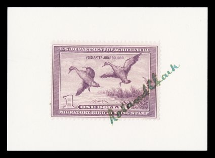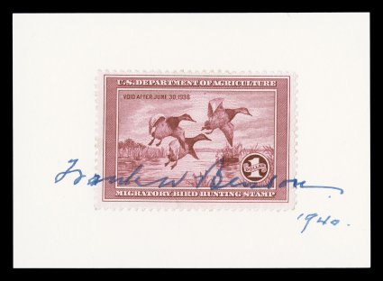 quite rare as some of the early artists would only sign for individual#RW1-9, 1934-42 Hunting Permits signed by the artists, each is on a separate 87x63mm white card, with the stamp "tied" to the card by the artist's signature, many of these are quite rare as some of the early artists would only sign for individual collectors and not en masse to the trade, #RW3, 4, 7 and 8 stamps have gum staining, others are fresh and very fine. (imagea) (imageb) (Image) Est. $1,500-2,000