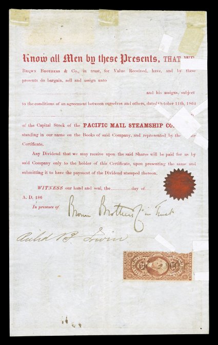 Certificate (R44c) on back, stamp on front tied by light c.d.s, stamp on backPacific Mail Steamship Company stock certificate, with a lovely engraved vignette, signed by Allan McLane as president, 25c Power of Attorney (#R48c) on front and 25c Certificate (#R44c) on back, stamp on front tied by light c.d.s, stamp on back with 1866 ms. cancel, blue dividend handstamps, cross cancels at bottom of certificate affect the signature and stamp on back, fine; a rare and impressive document. (imagea) (Image) Est. $3,000-4,000