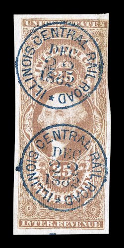887 c Postage issues used as revenues, 28 documents with postage stamps used to pay the revenue, including a couple with mixed revenue frankings, majority is 1861 Issue, including seven with 2c Black Jacks and one with 5c (#76), 1869 Issues include one with 2c and one with a pair of 6c (seldom seen used as a revenue), others are mostly Bank Notes, but we do note one with a 2c Trans-Mississippi and another with the 8c Bureau Issue on a lovely engraved railroad stock certificate, majority fine or better. Est. $400-500