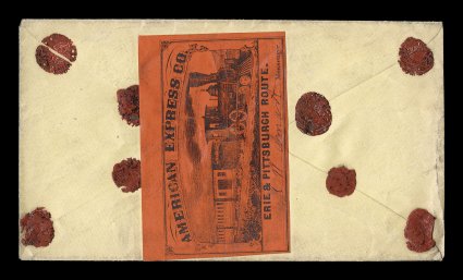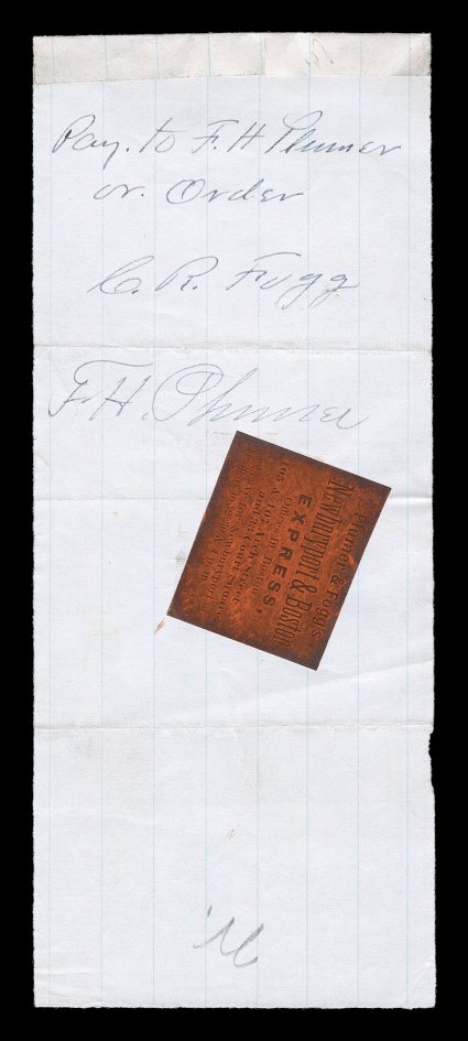 Express Co. (Attica, Ind.) used along with 1c Express revenue stamp on U.SExpress labels on documents, six items, including Amercian Express Co. (Erie & Pittsburgh route) on back of cover, American Express Co. (Lafayette, Ind.) and United States Express Co. (Attica, Ind.) used along with 1c Express revenue stamp on U.S. Express Co. receipt, plus Plummer & Fogg's, Niles & Co's (Boston and Dover), Marshall & Moulton's and Page & Saville's, each on a handwritten note, fine-very fine group. (imagea) (imageb) (imagec) (Image) Est. $200-300