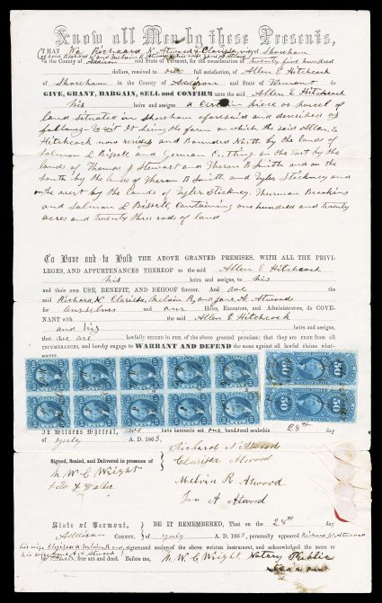 large margins all around, light ms. cancels, pre-usage horizontal crea#R33a, 10c Certificate, imperforate, block of ten (2x5), used along with pair of 50c Mortgage part perf. (#R59b) on 1863 conveyance of land from Shoreham, Vermont, stamps with large margins all around, light ms. cancels, pre-usage horizontal crease between second and third rows, otherwise very fine; this is the largest known multiple of #R33a and the only multiple (on or off document) larger than a strip of five. (Image) $3,850.00+