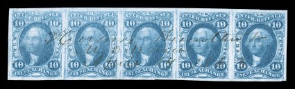 the only recorded strip of five, with just one larger multiple known.#R36a, 10c Inland Exchange, imperforate, horizontal strip of five, large balanced margins all around, neat ms. cancel, left stamp with tear at top, otherwise very fine; this is the only recorded strip of five, with just one larger multiple known. (Image) $2,150.00+