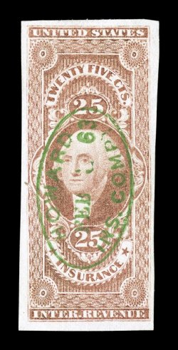 dated Feb. 1863, faint trace of a crease in top margin, otherwise e#R46a, 25c Insurance, imperforate, four large margins, lovely rich color and a crisp impression, marvelously cancelled by a bright green handstamp of Howard Insurance Company dated Feb. 1863, faint trace of a crease in top margin, otherwise extremely fine; a visually striking example. (Image) $11.00