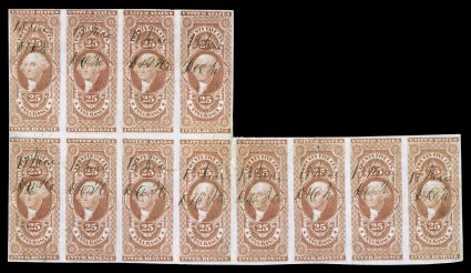 following lot are the only known multiples greater than a block of fou#R46a, 25c Insurance, imperforate, irregular block of twelve, bright color, light ms. cancels, small repairs (mostly closing minor tears), very fine appearance; this and the following lot are the only known multiples greater than a block of four. (Image) $1,585.00+
